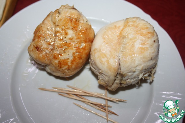 Поджарить куриные шарики на хорошо разогретом масле со сторон, особенно - на шве. Вытащить зубочистки.