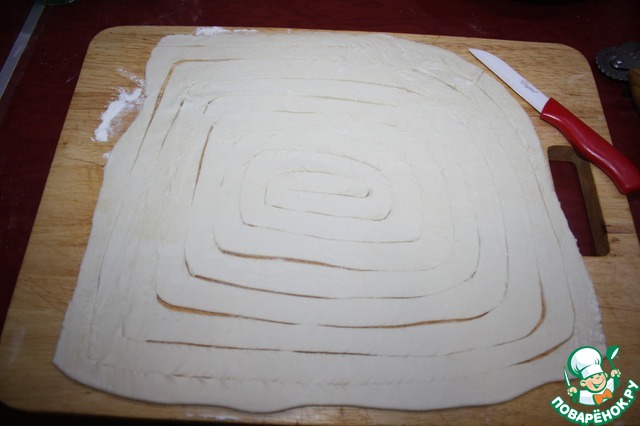 Тесто разморозить, немного раскатать доске, посыпанной мукой. Нарезать тесто по спирали полосой одинаковой толщины, начиная снаружи квадрата.