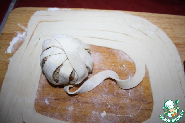 Закрутить тесто клубком вокруг куриного шарика, оставив небольшой свободный конец для антуража.