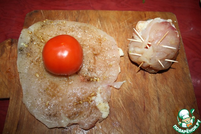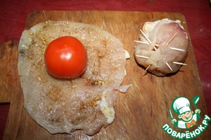 Выложить помидоры на куриное филе начинкой вниз, обернуть, закрепить зубочистками.