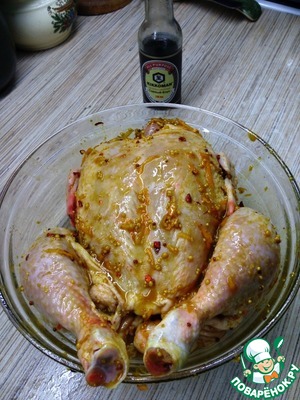Натираем нашу красотку смесью сверху и изнутри. Оставляем мариноваться часа на 2.