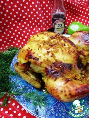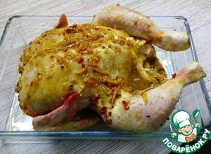 Когда курочка промариновалась, укладываем в, смазанную маслом, форму для запекания, накрываем фольгой и ставим в разогретую до 200С духовку минут на 40-50.
