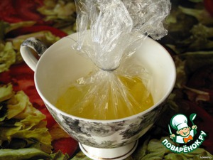 Собрать пленку в мешочек и завязать нитками. Проверить прочность и целостность пленки! Во избежании прилипания яйца к пленке - смажьте ее растительным или сливочным маслом.