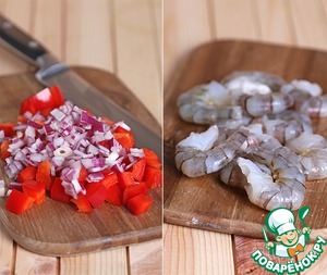 Избавляем перец от сердцевины, нарезаем небольшими квадратами, лук режем мелко. Креветки можно брать свежие или мороженые (но желательно серые, еще не сваренные, так в них сохраняется горазо больш вкуса и витаминов), предварительно их разморозив. Креветки нужны большие, тигровые. Однако у меня они не очень большие, хоть и продавались свежемороженными и назывались тигровые. Таких как у меня креветок нужно раза в 2 больше, а если Вам удалось раздобыть настоящих гигантов, то возможно у них еще нужно будет вытащить венку, об этом например тут: http://www.povarenok .ru/recipes/show/814 56/ -