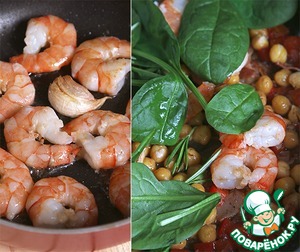 Когда нут уже почти протушился, обжариваем креветки - в паре столовых ложек оливкового масла, добавив 2 приплюснутых зубчика чеснока и присолив, буквально по 30-45 секунд с каждой стороны. Добавляем к нуту креветки, розмарин (в оригинале базилик), листья шпината и тушим, помешивая, буквально пару минут, чтобы шпинат "увял".
