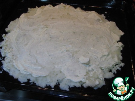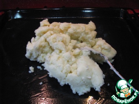 • Готовое картофельное пюре делим на части. Сначала я хотела сделать в форме, но она оказалась мала для такого количества, и я перенесла на противень.