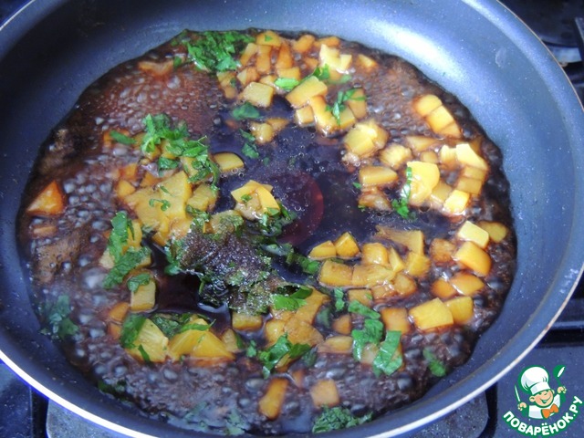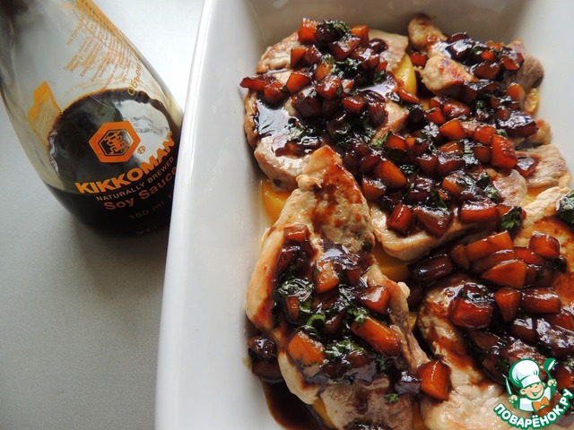 В масло, в котором жарилось мясо, выложить нарезанные кубиками персики, добавить соевый соус Kikkoman, 50 мл сока от персиков, сахар, соль, перец и мелко порезанную петрушку.