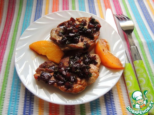 Вкусное мясо в карамели и в персиках.