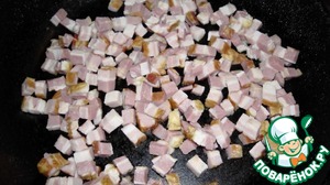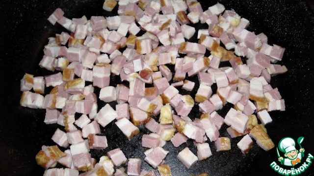 В разогретой сковороде обжариваем нарезанный кубиками бекон до золотистого цвета.