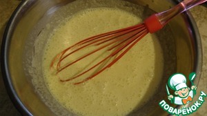 В жидкую смесь вводим сухую и хорошо перемешиваем. Добавляем бекон и перец. И еще раз перемешиваем.