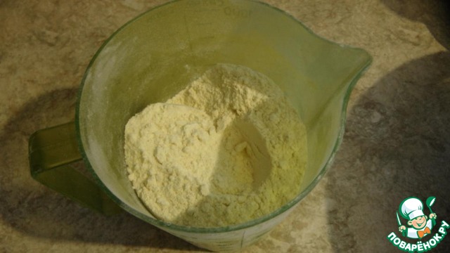 Смешиваем оба вида муки, соль, соду и разрыхлитель.