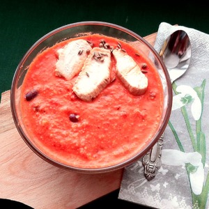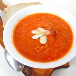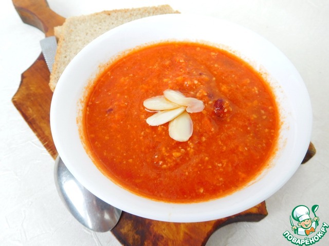 Этот суп обладает очень насыщенным вкусом и красивым цветом. В нем необычно и интересно сочетаются печеный болгарский перец и миндаль с зирой, кориандром и тмином.