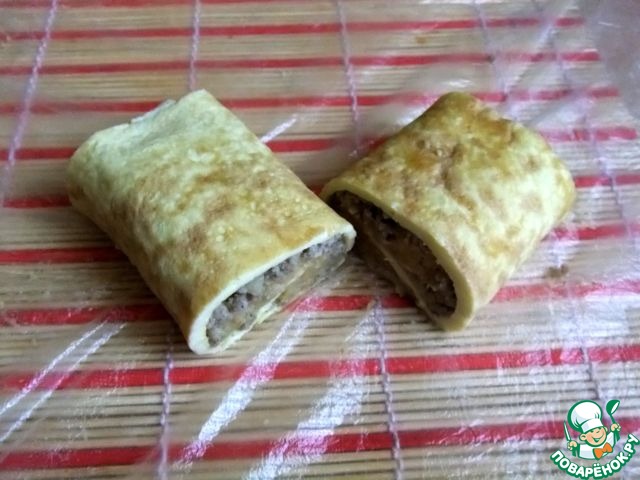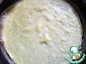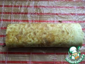 Яйца взбить с молоком и 1 стол. лож. муки. Посолить по вкусу. Пожарить тонкий омлет на сковороде под крышкой, чтобы он прожарился одновременно с двух сторон. Можно и в духовке запечь.