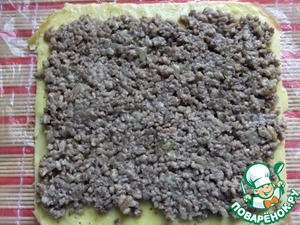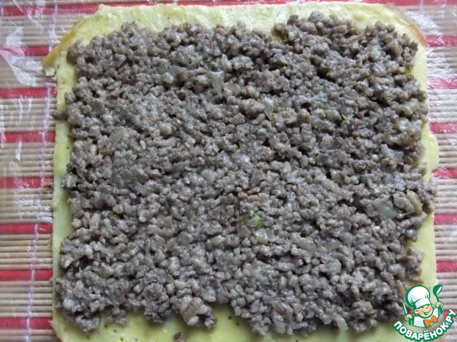 Вторую луковицу мелко порезать и обжарить на сливочном масле. Добавить фарш и потушить до его готовности.