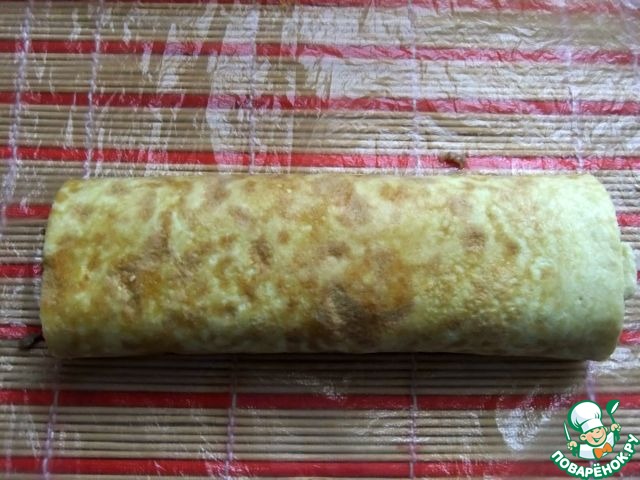 Собрать рулет: На стол постелить коврик для роллов, или чистую ткань, сверху пищевую пленку или разрезанный пакет, на него уложить омлет.