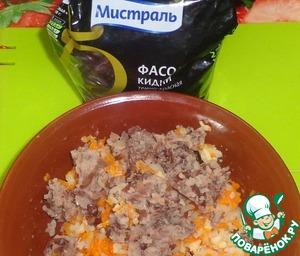 Отварную фасоль размять или пропустить через мясорубку и добавить к рису и моркови. Посолить начинку по вкусу.