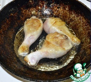 Куриные голени обжарить на растительном масле без запаха с двух сторон до румяной корочки.