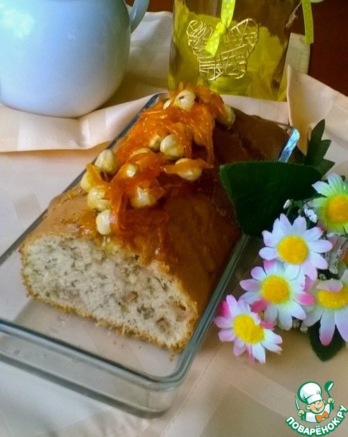 К сожалению, у меня пока нет формы для кекса, пришлось печь в прямоугольной и кекс лопнул в центре, но я украсила его апельсиновыми цукатами и орехами в меду, замаскировав этот небольшой огрех))
