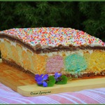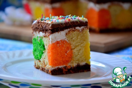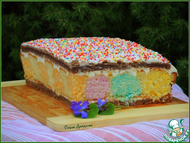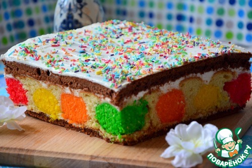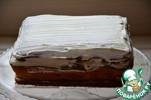 Следом укладываем белый корж, опять промазываем сметанным кремом. Завершающий шоколадный корж, также сверху промазываем кремом. Обрезаем неровные края. И украшаем кондитерской посыпкой. Даем пропитаться часа 2 в холодильнике. Приятного аппетита!