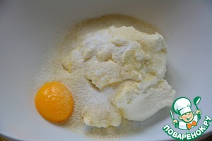 Для начала нужно приготовить кокосовые шарики. В чашке смешиваем творог, сахар, ванилин, манку и яичный желток