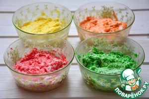 Творожную массу поделим на 4 части. В каждую часть добавим по 20 гр разноцветной кокосовой стружки
