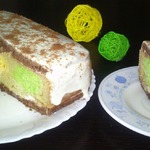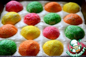 Следом в ту же форму выкладываем белое тесто. Достаем кокосовые шарики из морозилки и укладываем их в тесто. Выпекаем 35-40 минут при темпер. 180*. По готовности даем выпечке хорошо остыть.