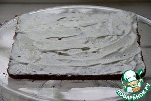 Собираем пляцок. Первый корж - шоколадный, промазываем кремом