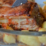 Далее переворачиваем грудинку шкуркой вверх, понижаем температуру до 160 градусов и запекаем ещё 30 минут. Если у вас грудинка больше по весу, то добавляем по 30 минут на каждые 0,5 кг.