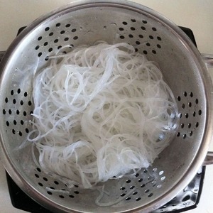 Фунчозу на 5 минут залить кипятком. Затем промыть холодной водой и обсушить.