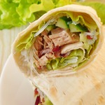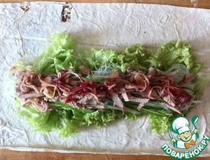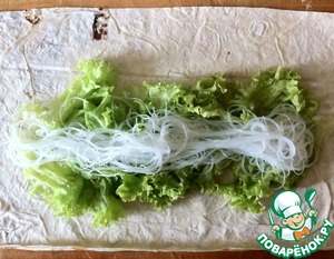 Лист лаваша разделить на две части. На каждую выложить посередине салатные листья, на них фунчозу.
