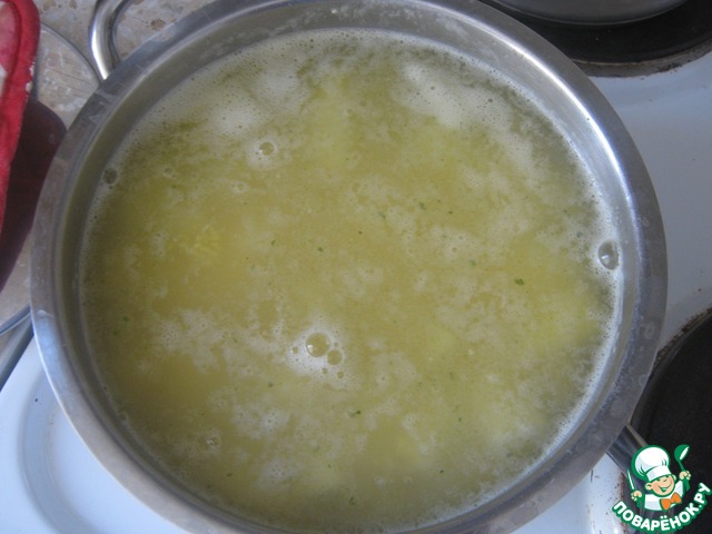 В это время почистить картофель, нарезать и добавить в бульон. Варить на среднем или маленьком огне около 20-30 минут. -