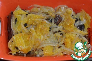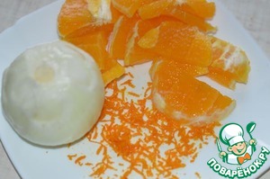 2. Лук нарезать полукольцами, с апельсина снять цедру, затем почистить и нарезать ломтиками. В сковороде разогреть масло, обжарить лук до прозрачности, добавить апельсин, цедру, лимонный сок, сахар. Тушить на медленном огне 5-7 минут, затем снять с огня.