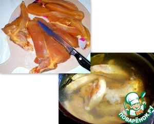 Куриное филе нарезала брусочками и сварила до полуготовности со специями и приправами.