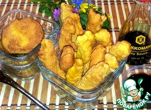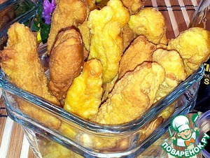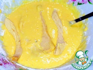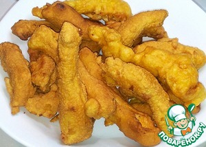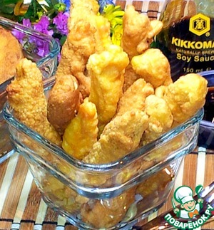 Куриные брусочки обмакнула в кляре и обжарила в кипящем масле до румяности со всех сторон. ( Кастрюлю использовала маленького диаметра. )