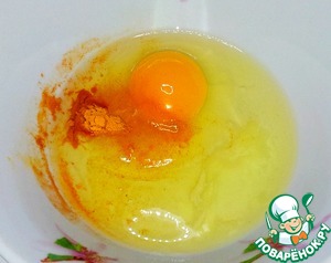 Для кляра разбила в миску яйцо и добавила один белок ( остался от предыдущего рецепта. ) В миску насыпала соль, куркуму, чесночный порошок и перец кайен.