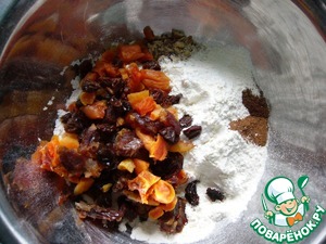Пока варится горох, взять сухофрукты, предварительно замоченные и просушенные, нарезать их небольшими кусочками. Орехи порубить мелко. Добавить в муку, смешанную с разрыхлителем, солью и специями. Перемешать