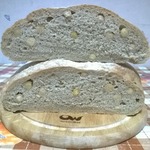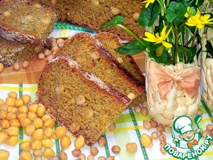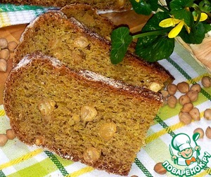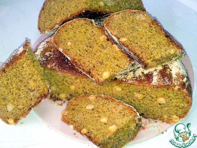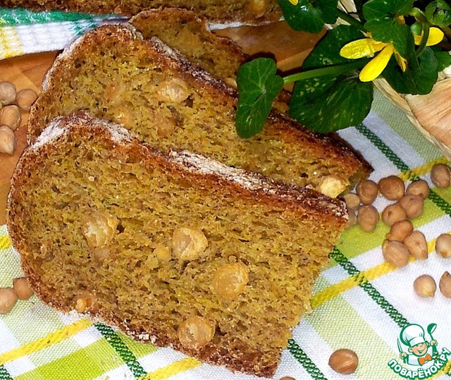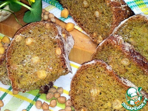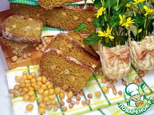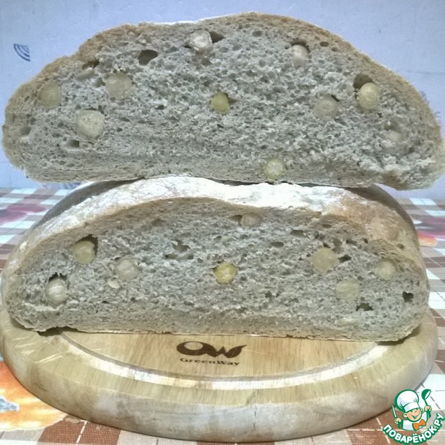В разрезе видно, что хлеб ноздреватый. Горошины похожи на орешки.