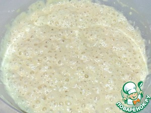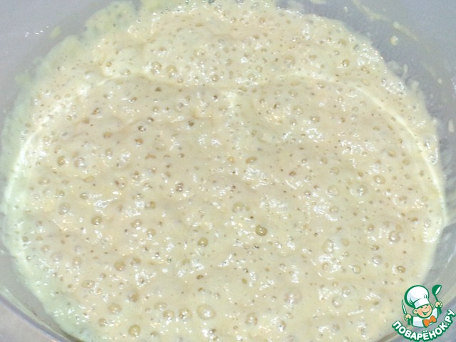 Через 30 минут опара забродила и поднялась. Насыпала в опару муку пшеничную и ржаную. Добавила воду и хорошо перемешала.