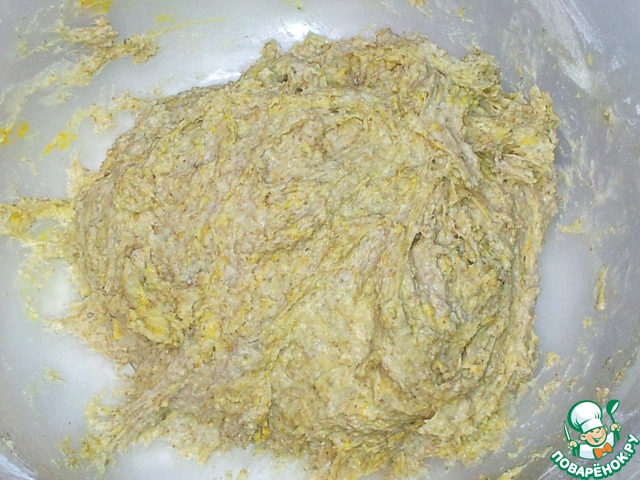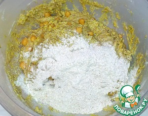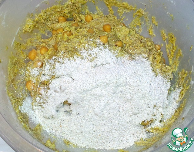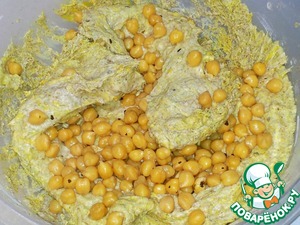 Нут сваренный на курином бульоне со специями переложила в тесто.
