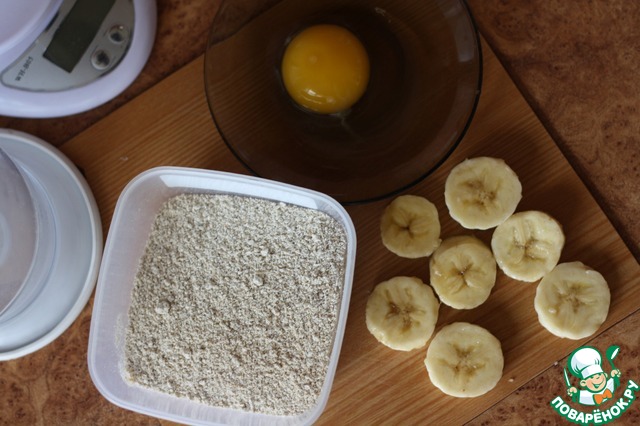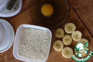 Овсяные хлопья (50гр/5 ст л/полстакана) блендором измельчить в муку, добавить туда 1 яйцо и половинку банана (по желанию можно добавить сухофрукты), снова всё перемешать.
