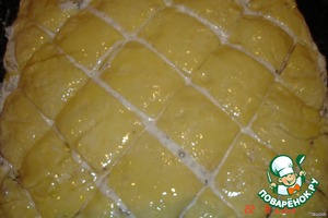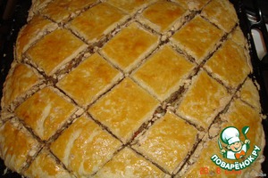 Готовую пахлаву ещё раз прорезать по уже прорезанным линиям (т.к. при выпекании начинка их затягивает).