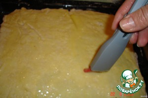 Tесто достали, разделили на 3 части, раскатали коржи по размеру противня.