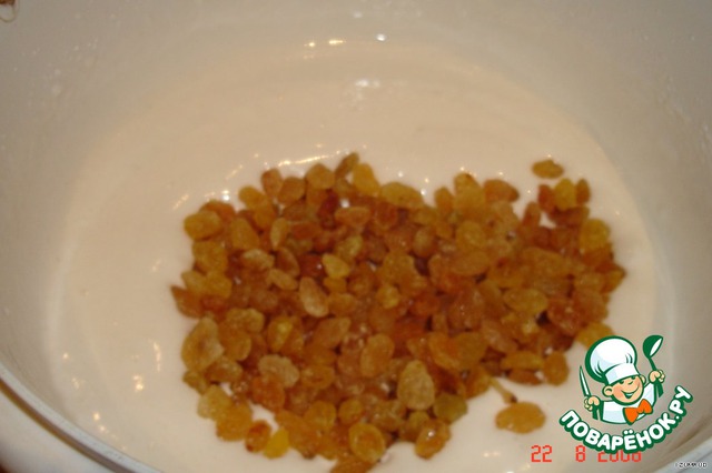 5 яичных белков взбиваем в густую пену, постепенно добавляя сахар и ванилин, во взбитые белки добавляем изюм... -