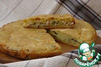 Hа противень укладываем один блин, на блин выкладываем половину начинки.