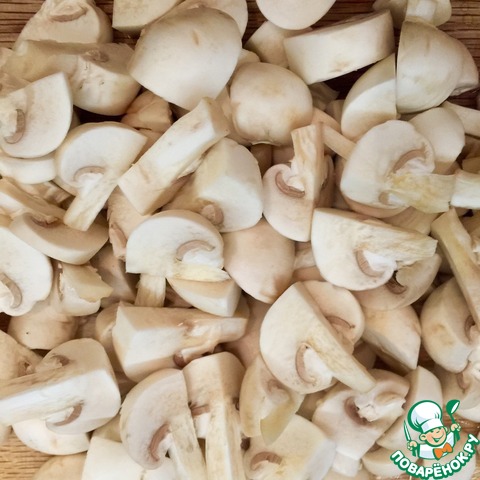 Грибы нарезаем крупно. Если Вы, как я, берете шампиньоны, но нарезайте их вместе с ножками крест накрест, так они дадут больше вкуса.