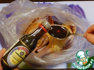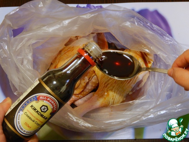 Утку я готовила в первые поэтому взяла 2 утиных и 2 куриных окорочка, чтобы сравнить. Промываем наши ножки и кладем в прочный пакет, вливаем туда оливковое масло и соевый соус