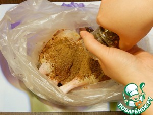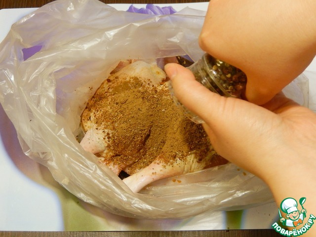 Добавляем в пакет перемолотые специи, пол чайной ложки корицы, лимонную цедру, молотую смесь перцев. Горсть целого бадьяна, и половинку палочки корицы. Закрываем пакет плотно и как следует перемешиваем. Оставляем мариноваться при комнатной температуре на 2 часа, или на 1-2 дня в холодильник. У меня мариновались сутки в холодильнике.