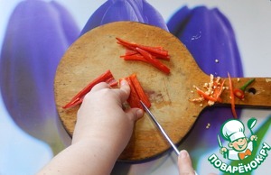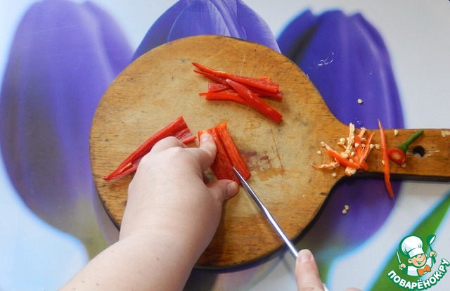 Когда ножки замаринованы, очищаем от семян перец чили и нарезаем. Духовку включаем на разогрев на 170 градусов.