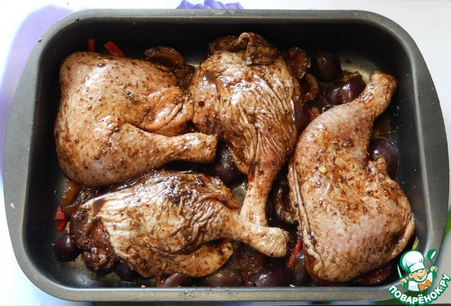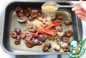 В сковороду или в лоток с высоким бортом выкладываем сливы, перец чили, добавляем сахар. Ноги достаем из маринада, а весь маринад выливаем на противень.