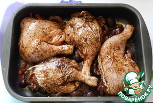Перемешиваем и распределяем ровным слоем. Ноги выкладываем сверху. Ставим в духовку на 2-2,5 часа, в среднем положении что бы противень не касался дна.